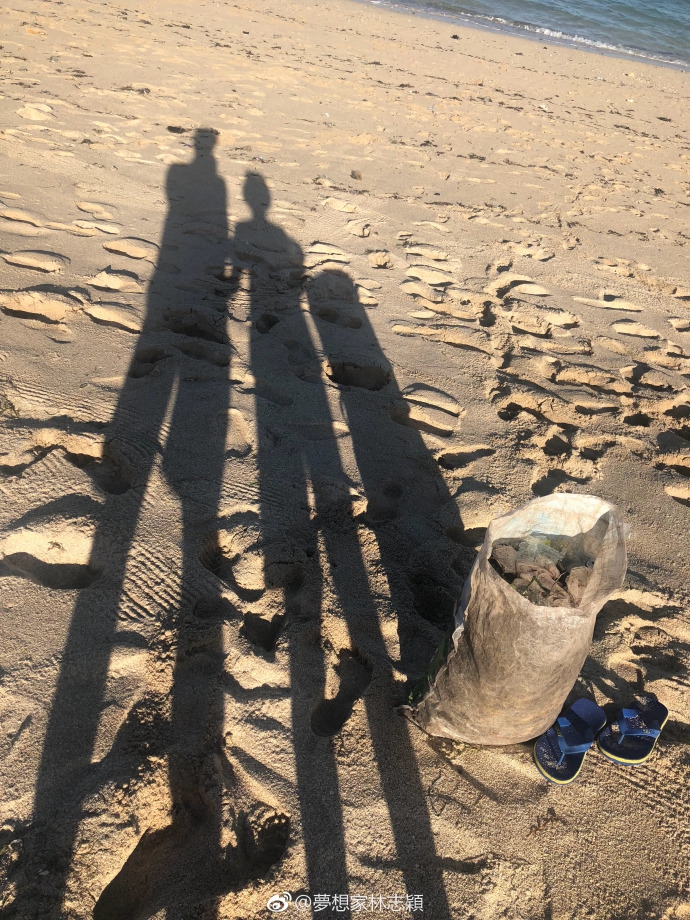 8月2日,林志颖微博晒和儿子kimi海边捡垃圾的照片称:“带着kimi捡垃圾帮海滩做环保!”照片中,kimi和爸爸在沙滩上捡拾游客丢的垃圾,小小的身影蕴藏满满的爱心,十分有爱,父子两的背影也尽显温馨。