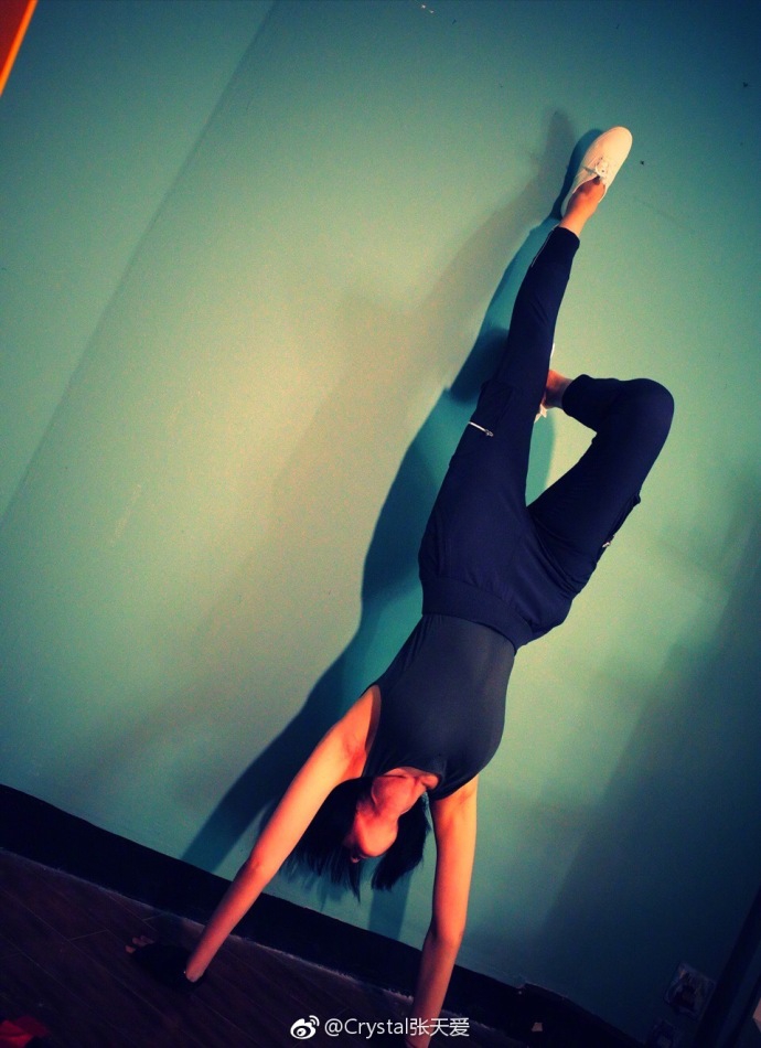 张天爱撑地倒立长腿抢镜纤腰明显