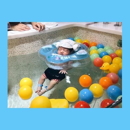 丁文琪23日晒出儿子的游泳照,分享自己带着儿子去体验婴儿游泳。照片中,快满1个月的酷比戴着羊角毛巾帽,头套在小泳圈里,整个人浮在游泳池上,他的眼睛闭着,疑似是在睡觉,一双小手和小脚也漂浮在水中,模样非常可爱。