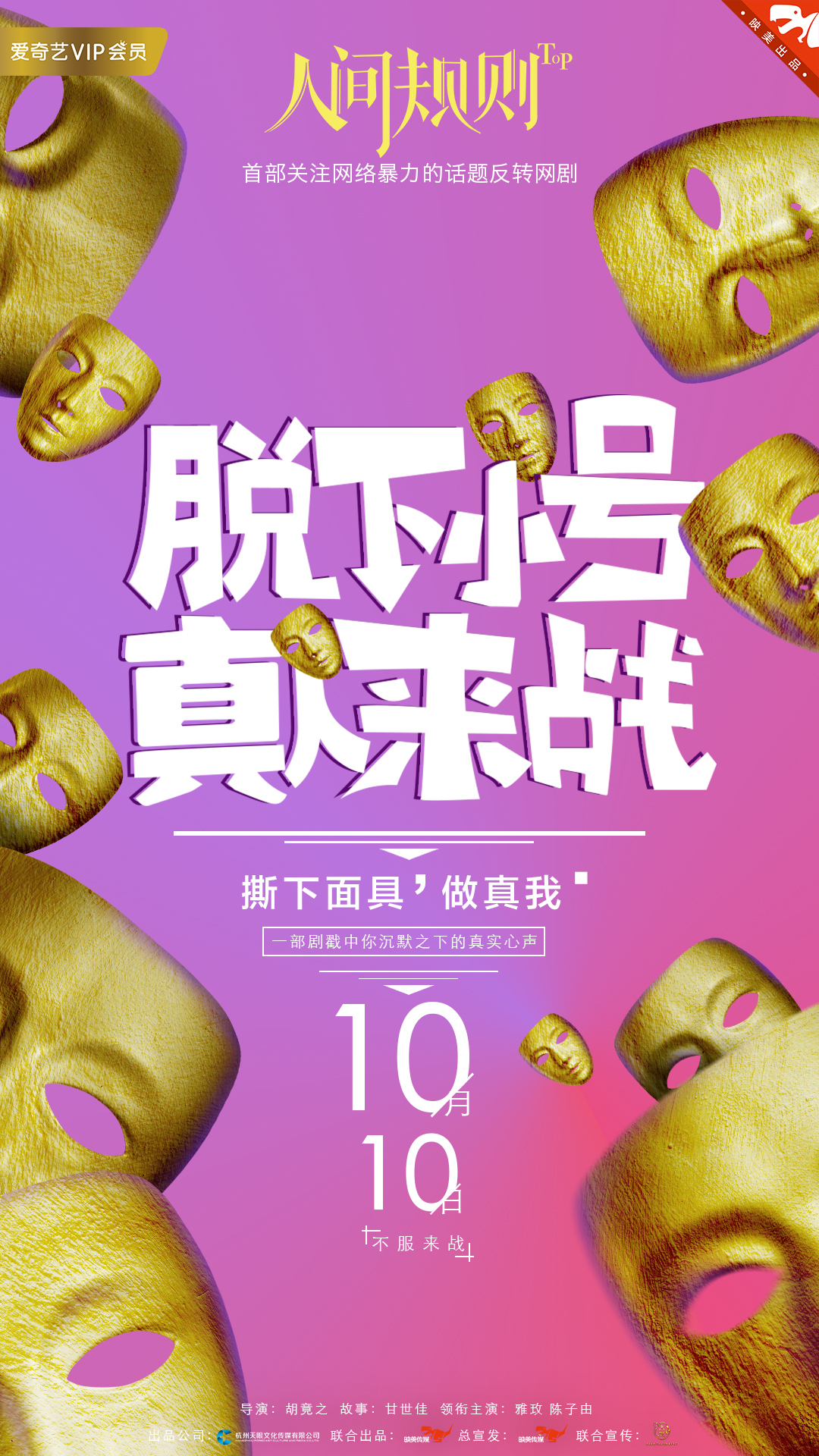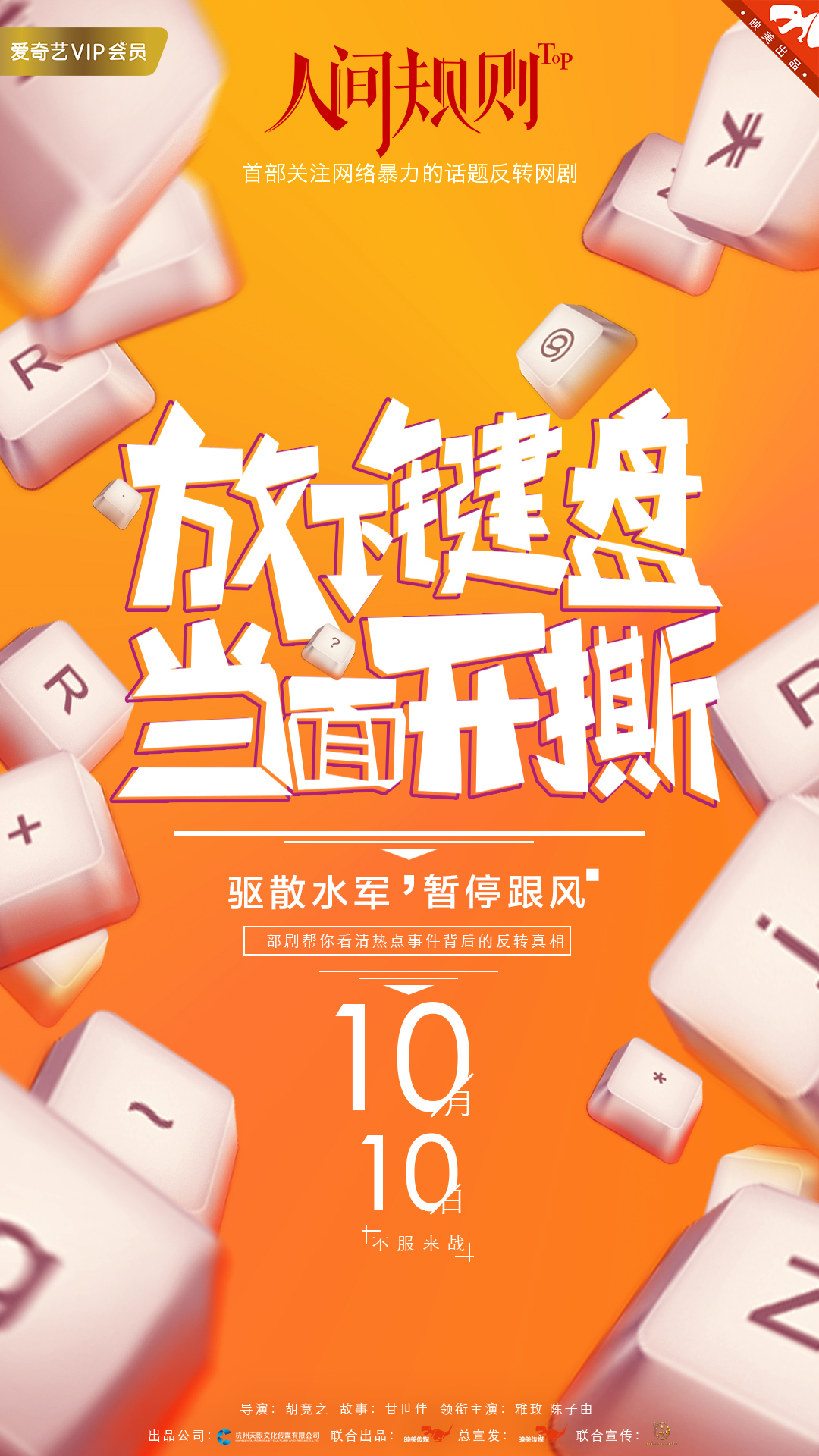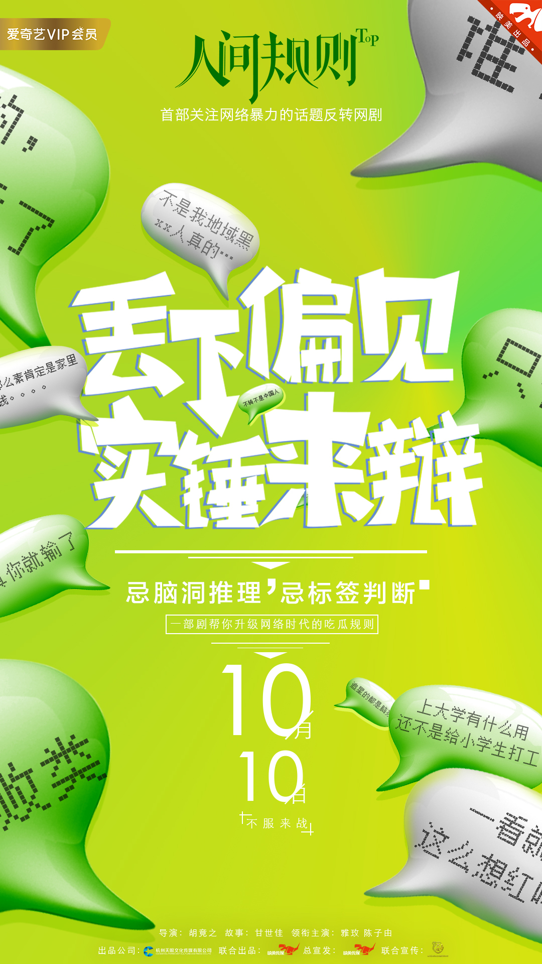 取材话题事件,直击网生代嗨点,一部剧带你看清热点事件背后的反转真相。国内首部关注网络暴力的话题反转剧《人间规则》定档10月10日上线爱奇艺,并公布了概念海报及先导预告片。该片由杭州天眼文化传媒出品,映美传媒联合出品、总宣发,天眼文化传媒董事长吴佳担任出品人,章力程担当制片人,新锐导演胡竟之执导,知名编剧甘世佳创作,实力小花雅玫、人气小生陈子由、于彦凯、华千涵、孙正霖等高人气优秀演员主演。