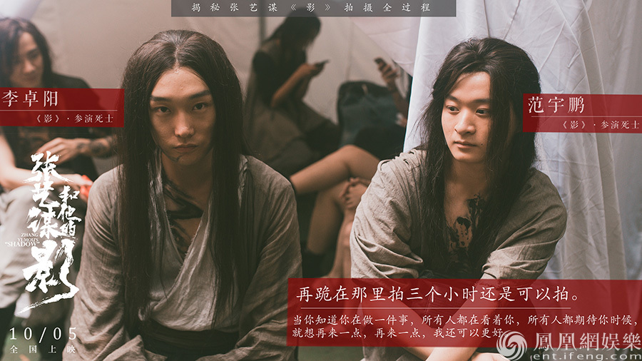 正如纪录片中摄影指导赵小丁所说“你想做这件事情,你就要做好它”,《影》的武术设计谷轩昭坦言,为呈现最好的效果,几秒钟的动作镜头也不惜一遍遍的重复推敲。在影片中死士的扮演者们有数十位,在摄制现场导演临时决定要拍摄几位死士的特写镜头,为了几秒钟的特写,他们在数小时的淋雨拍摄中一遍遍重来。在电影中饰演死士的范宇鹏、李卓阳谈及角色表示:“怎么拍都不够,再拍三个小时跪在那里还是可以拍,当你知道你在做一件事,所有人都在看着你、所有人都在期待你时候,就想再来一点,再来一点,我还可以更好。”