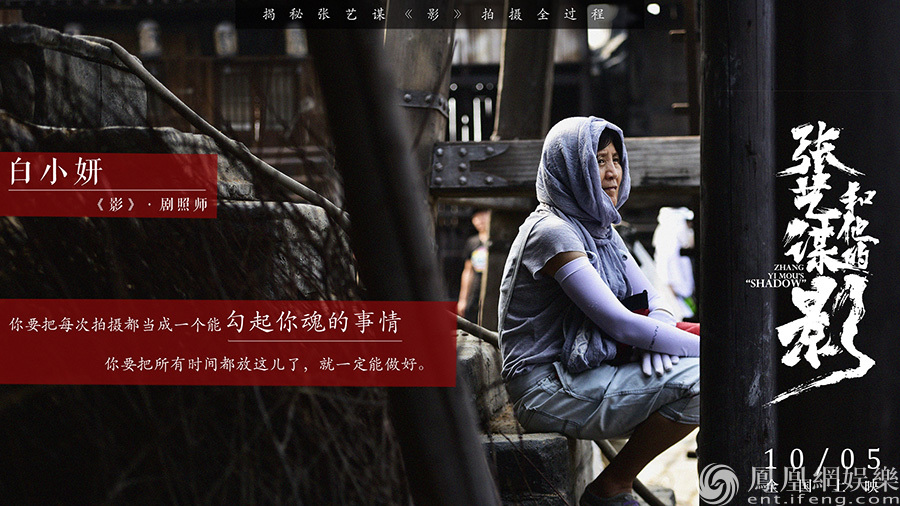 在纪录片中,《影》的海报设计师黄海曾说到:“最喜欢《影》的剧照,看到的一瞬间就感觉这电影在眼前了。”如此令人惊艳赞叹的剧照其实是剧照师白小妍在片场摄制时通过抓拍记录下最真实、最动人的一瞬。从《摇啊摇要到外婆桥》开始,白小妍与张艺谋导演合作已长达二十年,她每天正常工作时间就要到凌晨三四点;在幕后的幕后,剧组外时刻待命的剧组厨师张计虎师傅忆起自己在剧组工作至今已经十七年,半辈子都奉献在剧组。而《影》的副导演任茂成则直言“但还是觉得如果可以,希望能一直干下去”。