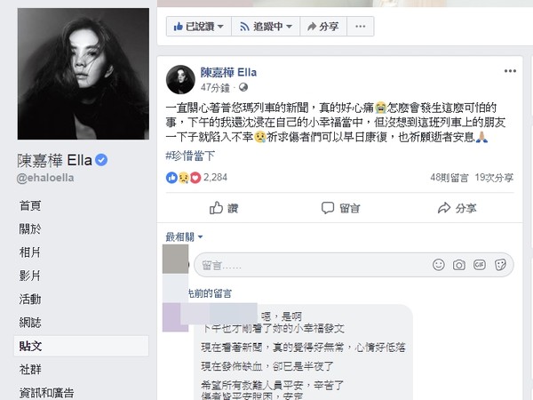 看到新闻后,Ella难过表示看到画面真的好心痛,还附上了痛哭的表情符号,直说:“怎么会发生这么可怕的事,下午的我还沉浸在自己的小幸福当中,但没想到这班列车上的朋友一下子就陷入不幸”,同时祈求伤者早日康复,亡者得以安息,自责情绪让粉丝看了也心疼,纷纷留言跟着一起祈福集气。