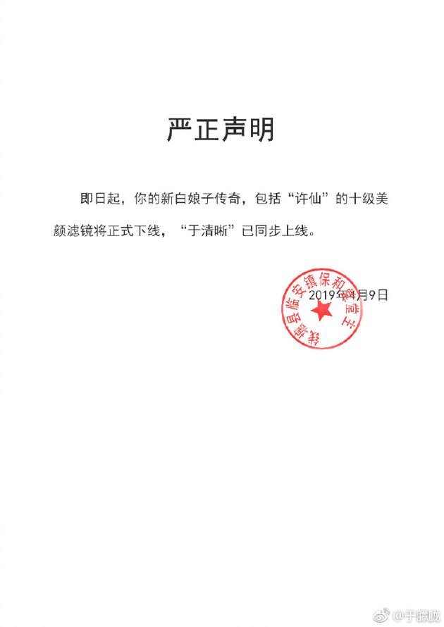 随后,于朦胧也在微博发布“声明”,表示“十级美颜滤镜将正式下线”,还自侃接下来的自己是“于清晰”,十分调皮可爱。