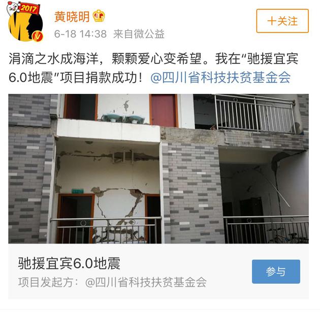 黄晓明在微公益发起的“驰援宜宾6.0地震”中捐款20万