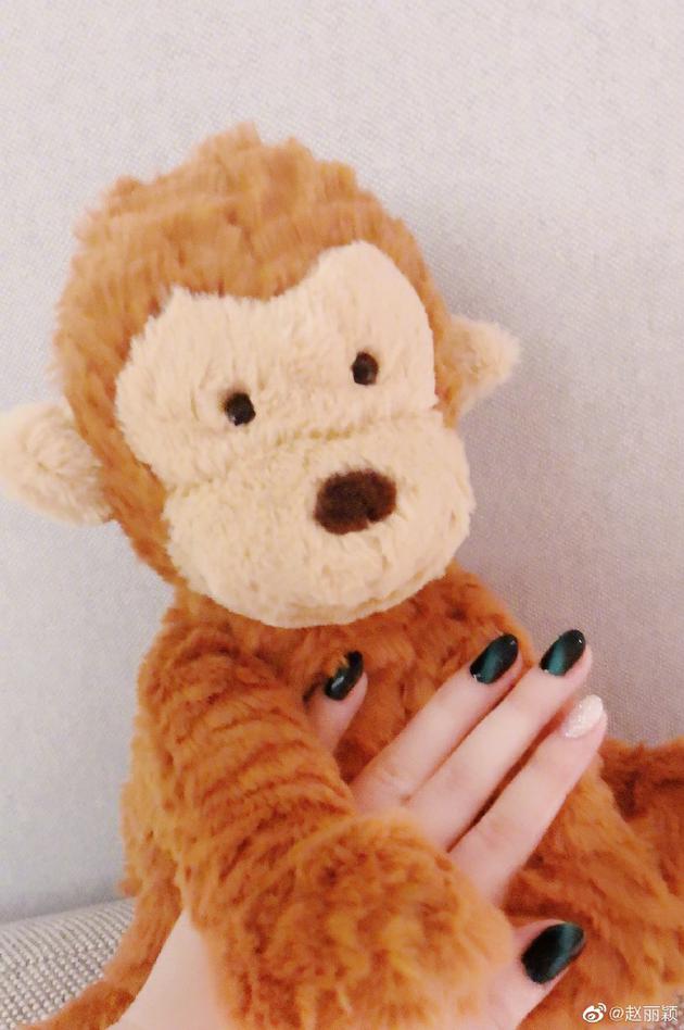 从赵丽颖晒出的照片来看,有着一双小手的她也将一只手放在小猴子玩偶上展示自己新染的指甲,五个手指也是涂了两种颜色,食指是白色带亮片指甲油,与其他以四指黑绿色指甲油成鲜明对比,很好看。网友也纷纷留言:“想你啦”、“姐姐已经涂好了指甲油,是不是要开始营业了!”