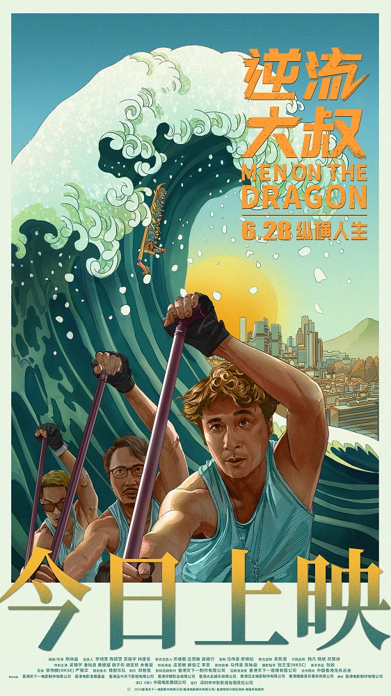 与此同时,片方还发布了极具设计感的“今日上映”手绘插画海报。细腻的笔触勾画出大叔们破风前行的英姿,身后飓浪的图腾则标榜着艰难而现实的香港社会,寓意影片展示出了现实的人生百态。四位大叔颠簸在各自的“中年危机”之中,唯有奋力划桨才是冲破困境的唯一方法。