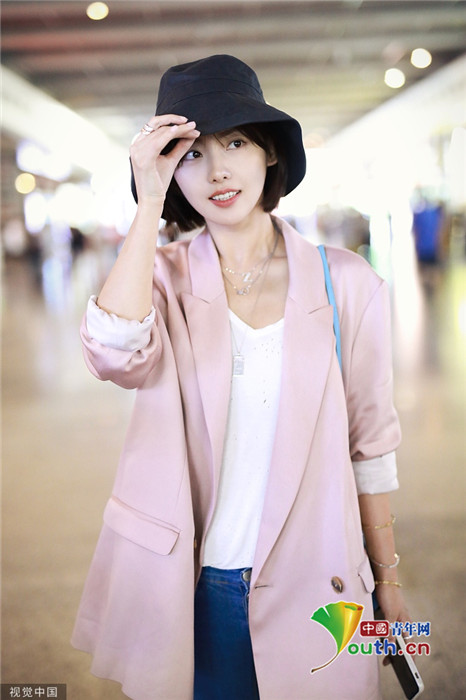 2019年7月1日,上海,张嘉倪现身虹桥高铁站。张嘉倪素颜现身女神气质不减,剪短发戴渔夫帽显俏皮,穿粉色外套显甜美大步流星秀美腿。