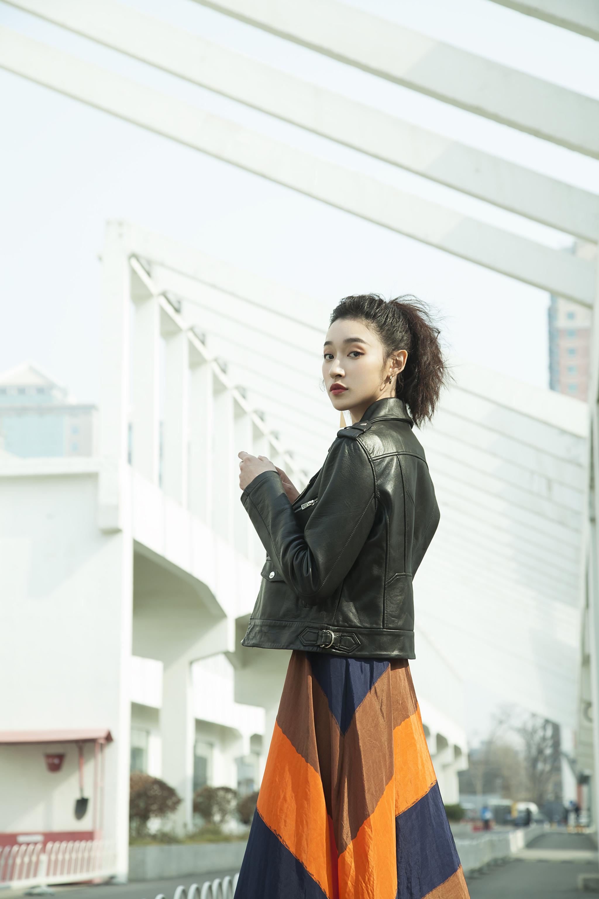 张馨比长裙皮衣混搭风街拍 柔和与硬朗集于一身