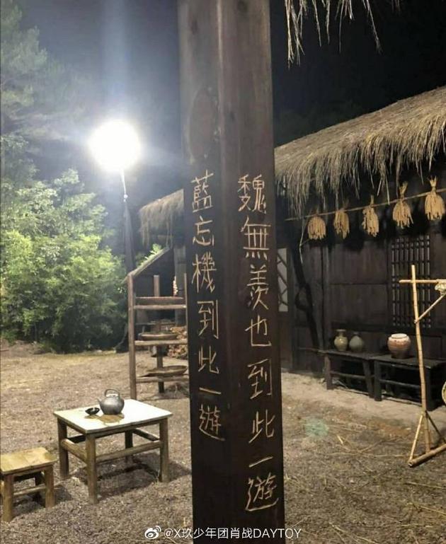 7月30日晚,在热播剧《陈情令》中饰演“魏无羡”一角的肖战通过微博上传片场照,称:“无论是古代还是现代!都不应该乱涂乱画!这是道具,请勿模仿额!!”照片中,简陋的茅草屋前立着一根柱子,上面写着“蓝忘机到此一游”“魏无羡也到此一游”的字样,真实呈现了日常生活中一些游客的写照。