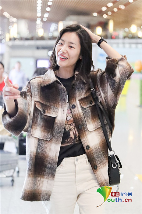 2019年9月23日,北京,刘雯现身机场。刘雯因为解约风波首次缺席时装周,穿格纹衬衫搭配白裤子黑靴亮相机场正常“营业” ,捂脸娇俏笑少女感满满。