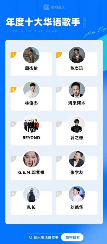 近日,酷狗音乐发布了《2022音乐生活白皮书》,从音乐人、歌曲流派、用户喜好、行业生态、流行趋势等多元视角,一起回顾与见证音乐领域这一年来的不凡历程,结合平台大数据分析对“年度十大华语歌手”、“年度十大新生代歌手”、“年度国风影响力歌手”、“年度说唱影响力歌手”、“年度最受关注新生代歌手”、“年度宠粉歌手”进行了公正的评选,为大家推荐2022年表现优异的音乐人。其中获得2022年年度十大华语歌手的是周杰伦、陈奕迅、林俊杰、海来阿木、BEYOND、薛之谦、GEM鄧紫棋、张学友、队长、刘德华。