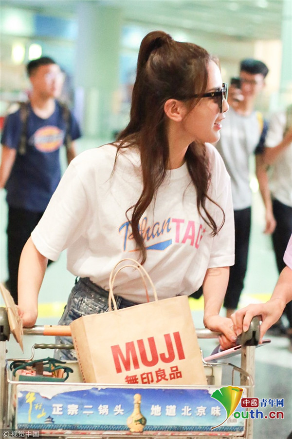 2018年8月3日,北京,“火箭少女”杨超越凌晨现身机场,她近日在团综上打嗝登上热搜,被赞有趣的灵魂,在机场推行李车炫女汉子怪力。