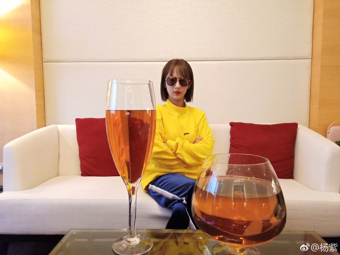 10月30日,杨紫在自己微博上传一组照片,并配文称:“酒量不好,只喝一杯!”照片中的她身穿黄色上衣,面戴墨镜,捧着超大高脚杯,调皮作喝酒状,看起来十分逗趣。