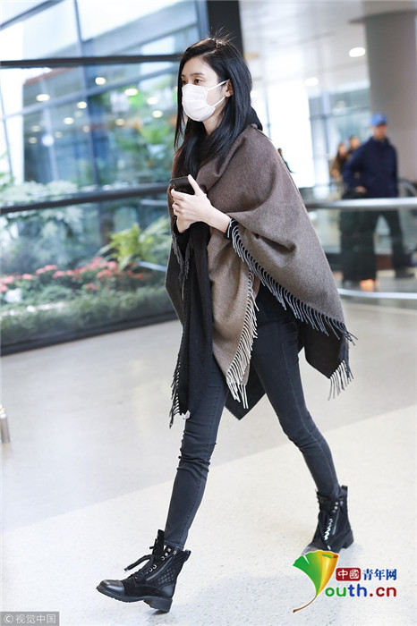 奚梦瑶披围巾赶飞机