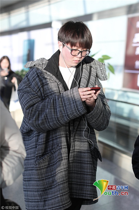 2019年1月16日,北京,毛不易现身机场。毛不易身穿宽松外套略显臃肿,一路听歌表情呆萌。锅盖头配红扑扑圆脸活似从漫画里走出的人物。