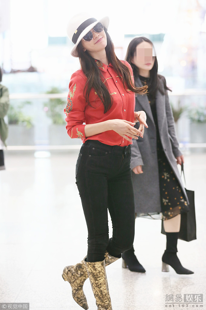 林志玲红衣搭牛仔裤秀长腿 见镜头歪头挥手