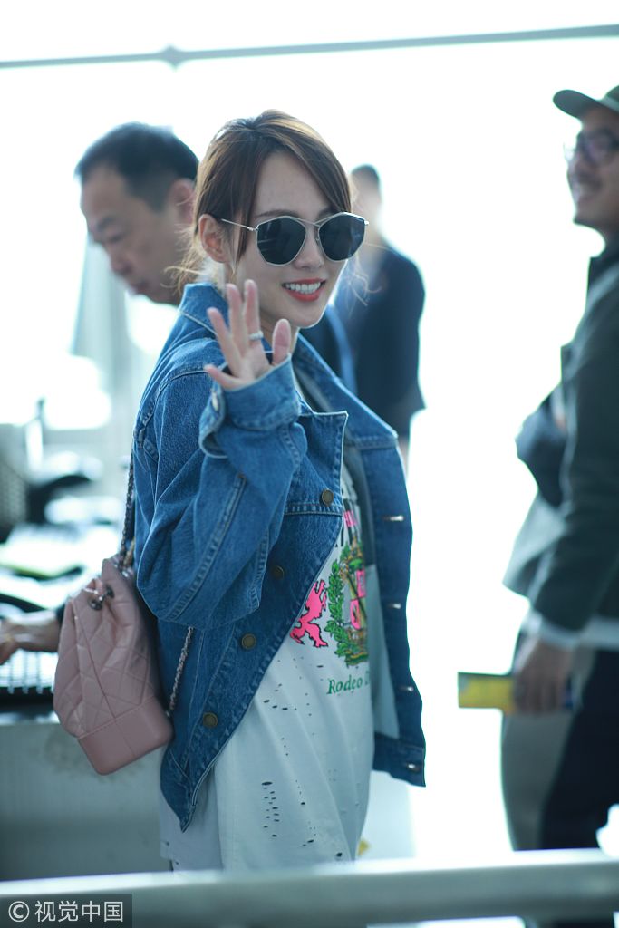 4月1日,张嘉倪与老公买超现身广州机场。两人同穿情侣牛仔装,一路对视热聊感情超甜,张嘉倪对镜头热情挥手举公仔,亲和力MAX。(视觉中国/图)