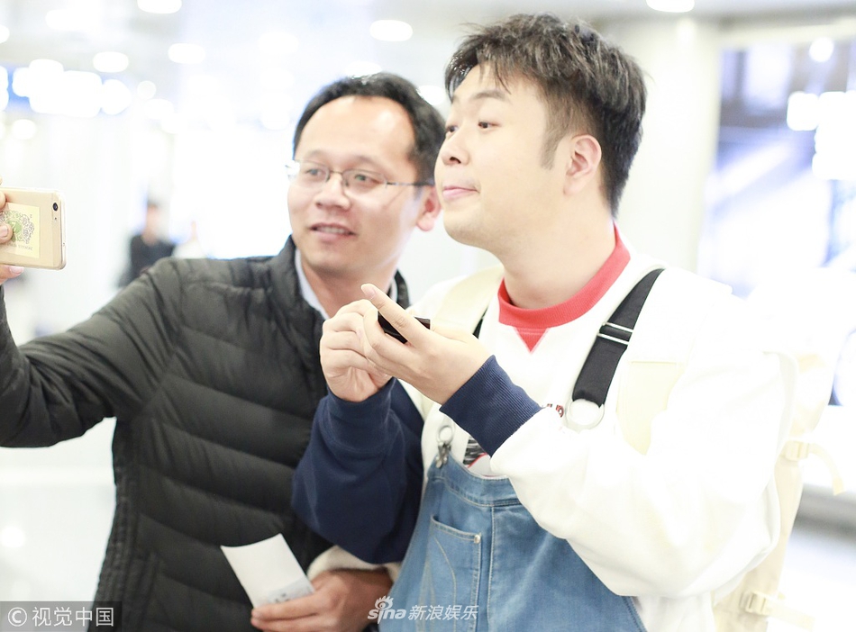 2019年4月8日,知名主持人杜海涛现身北京机场,他身穿背带裤造型呆萌,酷似胖版超级玛丽,一路上和粉丝热聊,还亲切与路人合影,拍照时更举双手比V卖萌,相当可爱。(图:视觉中国)