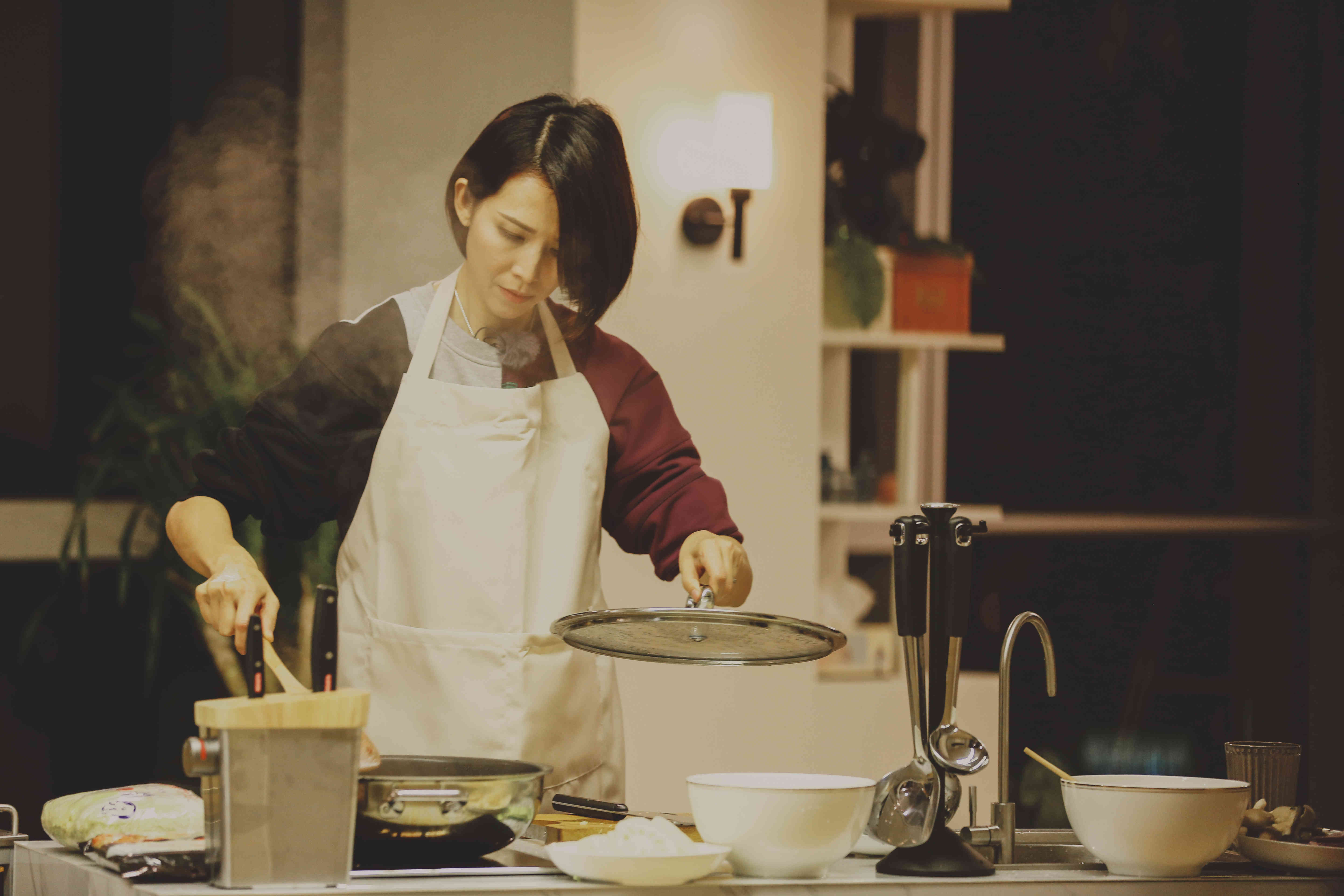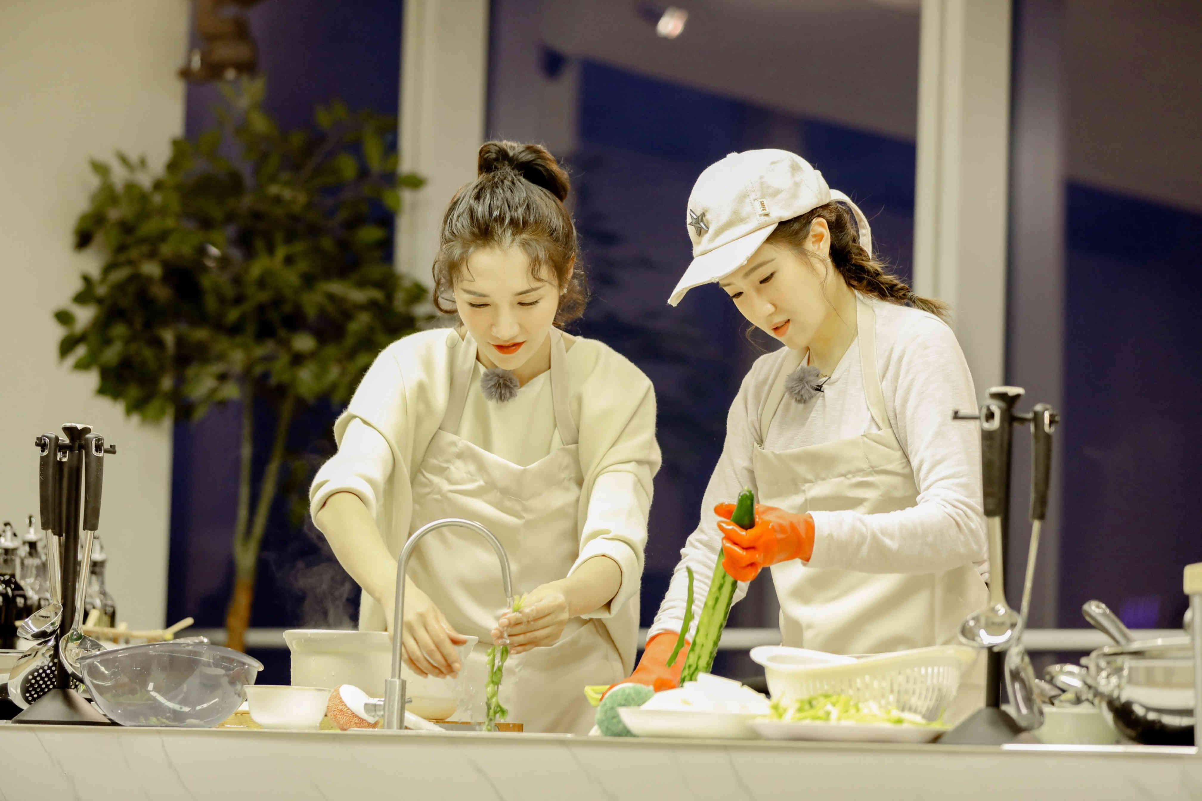 蔡少芬身穿拼色卫衣戴白色围裙,切菜、炒菜动作娴熟利落;钟丽缇也同样得心应手,特意准备了张伦硕和婆婆喜爱的菜肴,不时还与蔡少芬交流经验。