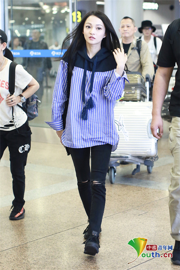 2019年4月25日,北京,张韶涵现身机场。她身穿蓝色衬衫搭配黑色紧身裤,大秀纤细身材和美腿,黑发造型凸显干净气质。