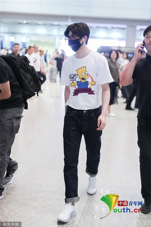 2019年6月27日,北京,蔡徐坤现身机场。他梳微卷毛随手撩头发都是满满的帅气,穿辛普森白衬衫清爽简约,把耳机塞到衣服里,俏皮赶路成风景线。