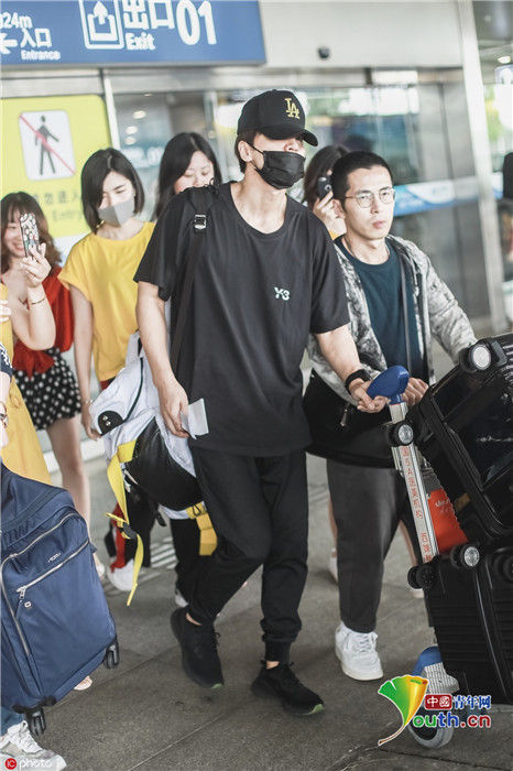 2019年6月30日,四川成都,言承旭现身机场。他“一身黑”低调前行,引路人好奇围观跟随。