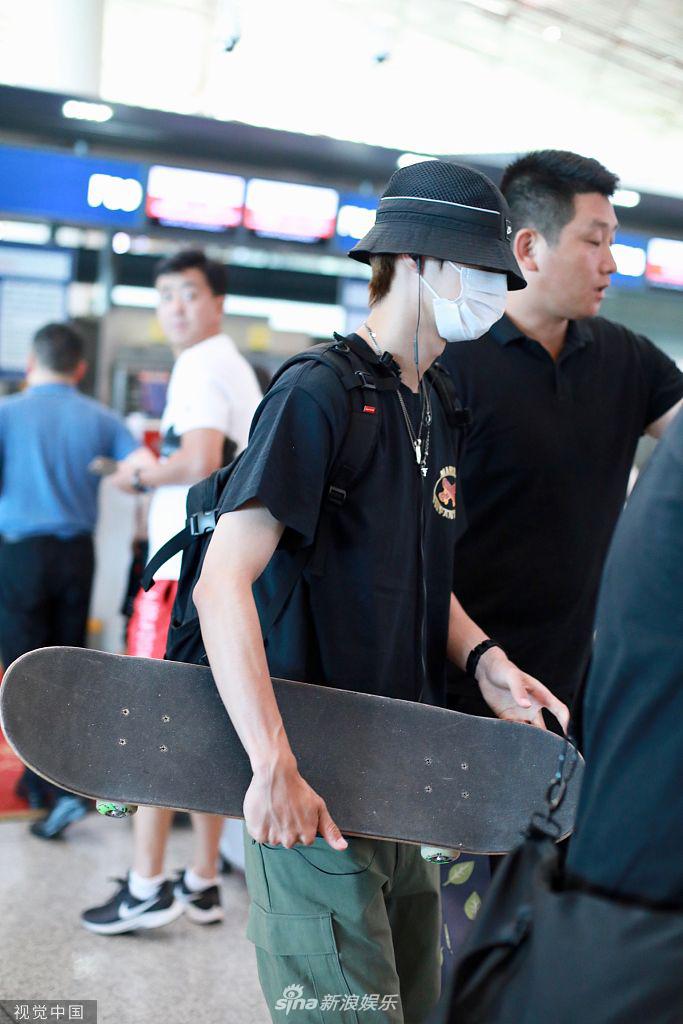 6月30日,北京,王一博现身机场。他身穿黑色T恤搭配工装裤,手拿滑板变运动少年,遮挡的很严实十分低调。