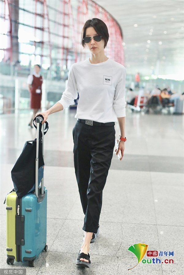 7月9日,北京,杜鹃现身机场。杜鹃短发造型走冷淡风显干练,戴墨镜面无表情气场大开,穿白衣黑裤秀长腿好身材,脚踩凉拖十分抢镜。