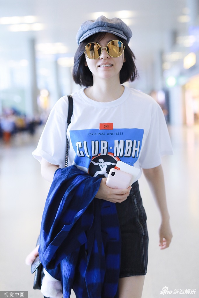 7月12日,张靓颖现身机场被拍。张靓颖一头短发配圆形墨镜不惧素颜面对镜头微笑打招呼,简单白T配A字裙亲切和善。(视觉中国/图)