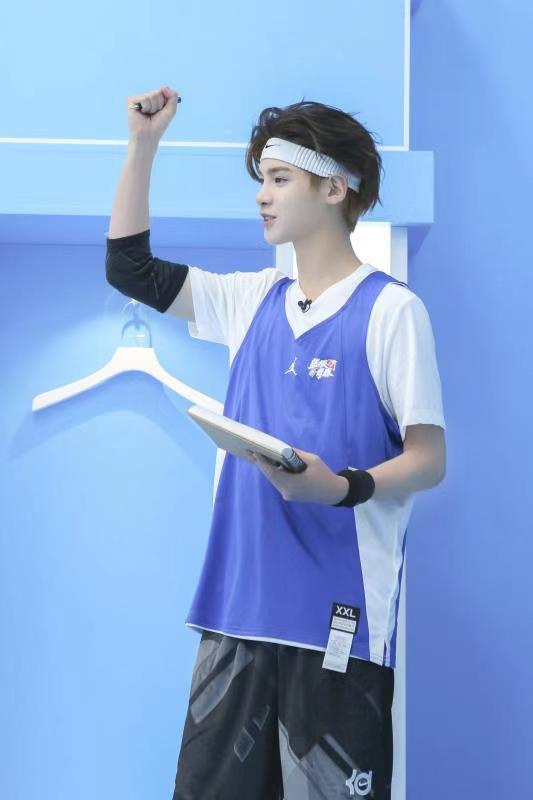 黄明昊Justin在某节目中变身球场爱豆,白T搭配篮球服尽显青春活力。