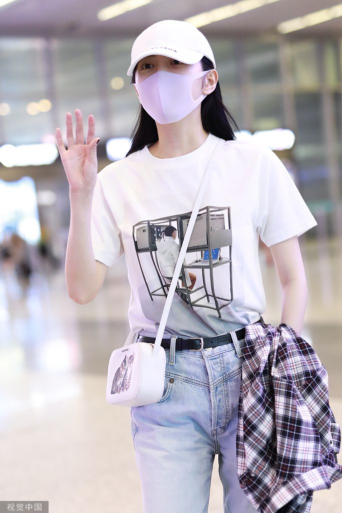 7月29日,景甜现身上海机场。她穿简约白T配牛仔裤走清新少女风,戴帽子口罩巧遮素颜,对镜挥手甜笑气质温柔十足。
