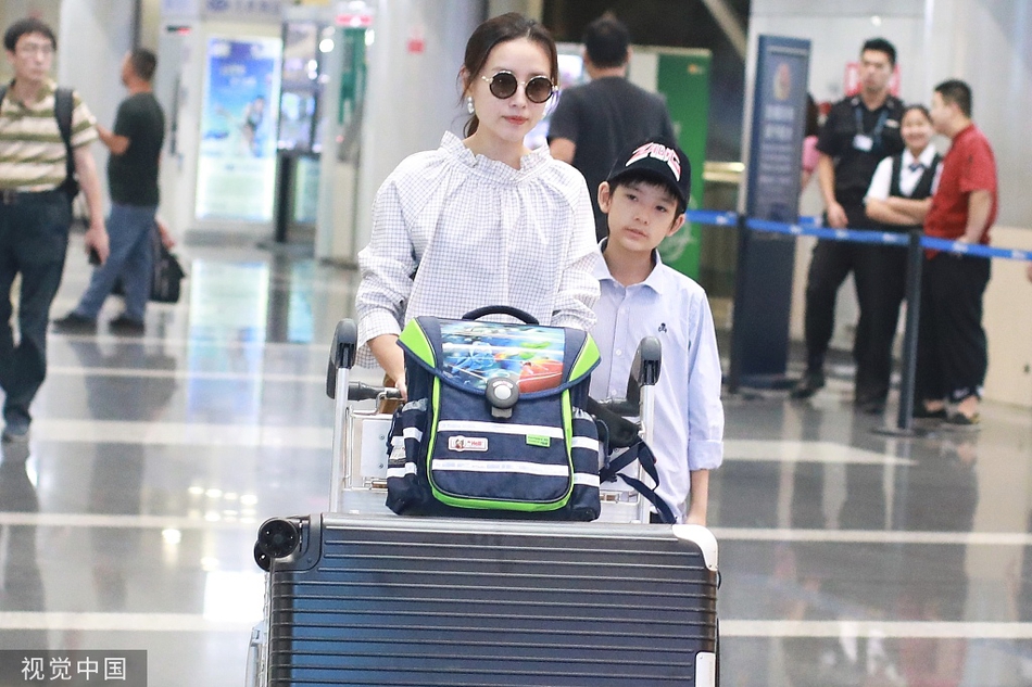 8月26日,董洁与儿子顶顶现身机场,董洁戴珍珠耳钉,穿花边领上衣搭配卡其色长裙,优雅大方知性美。长高不少的儿子顶顶戴棒球帽穿蓝色棒球帽,乖乖的跟在董洁后面。(视觉中国/图)