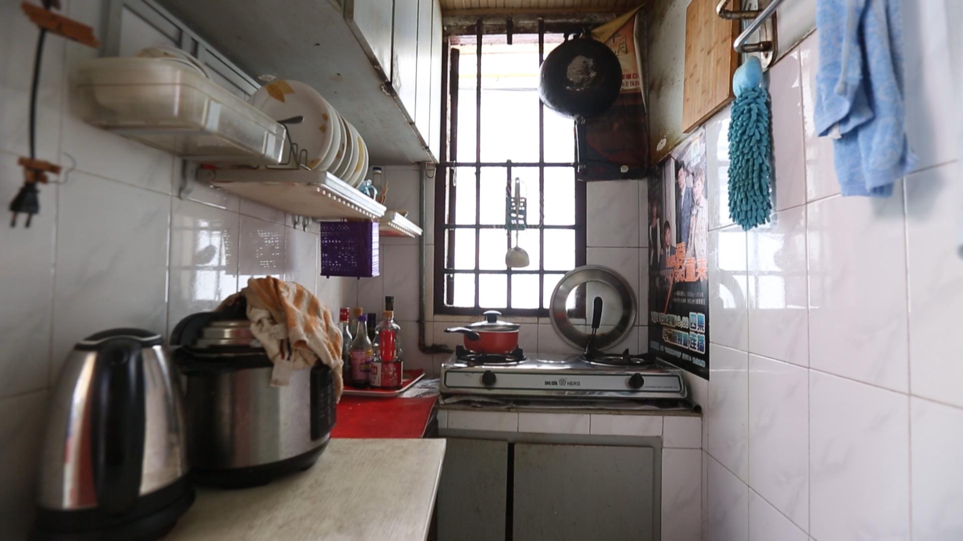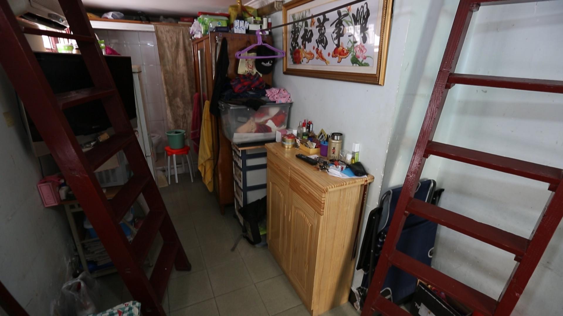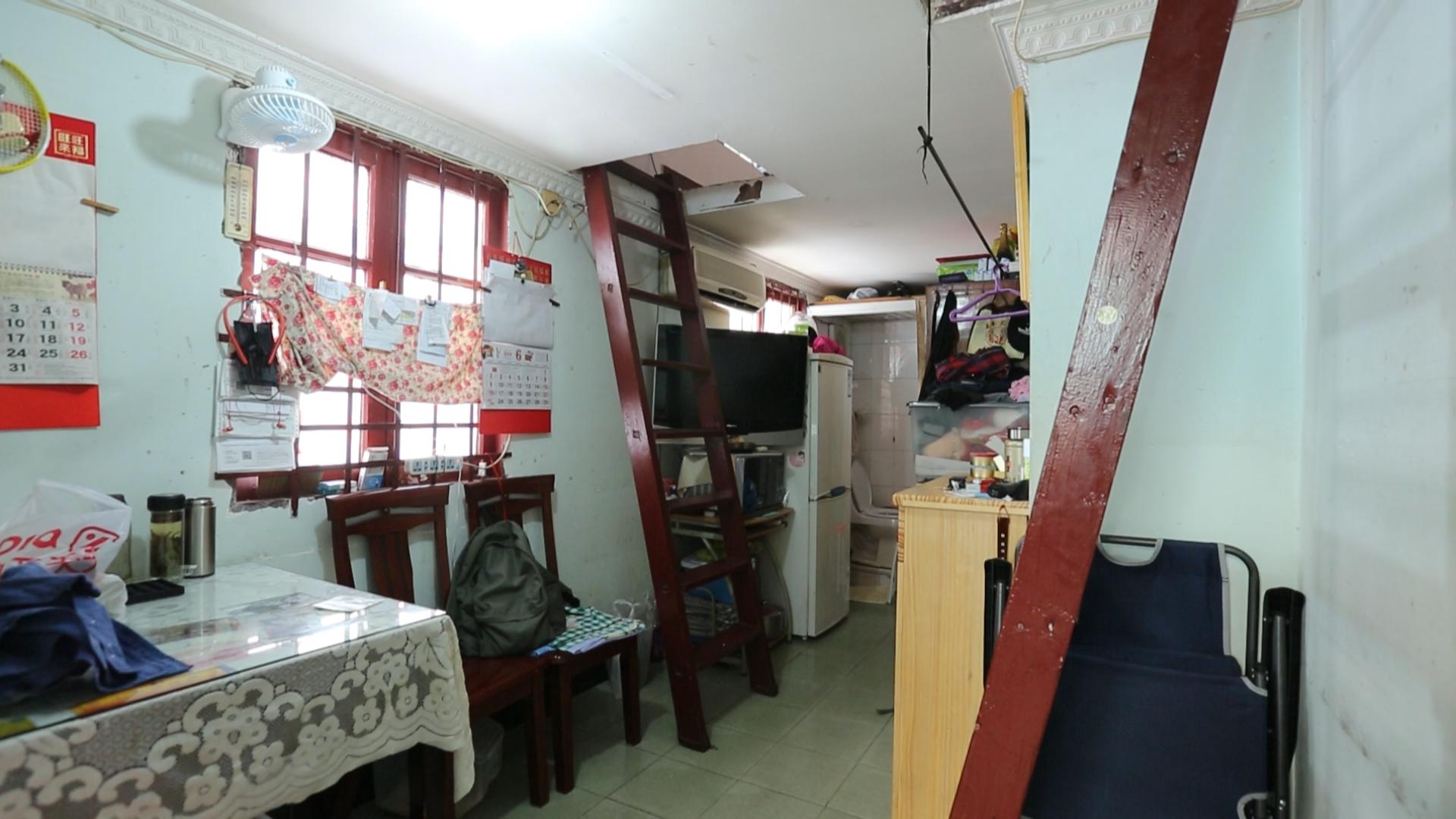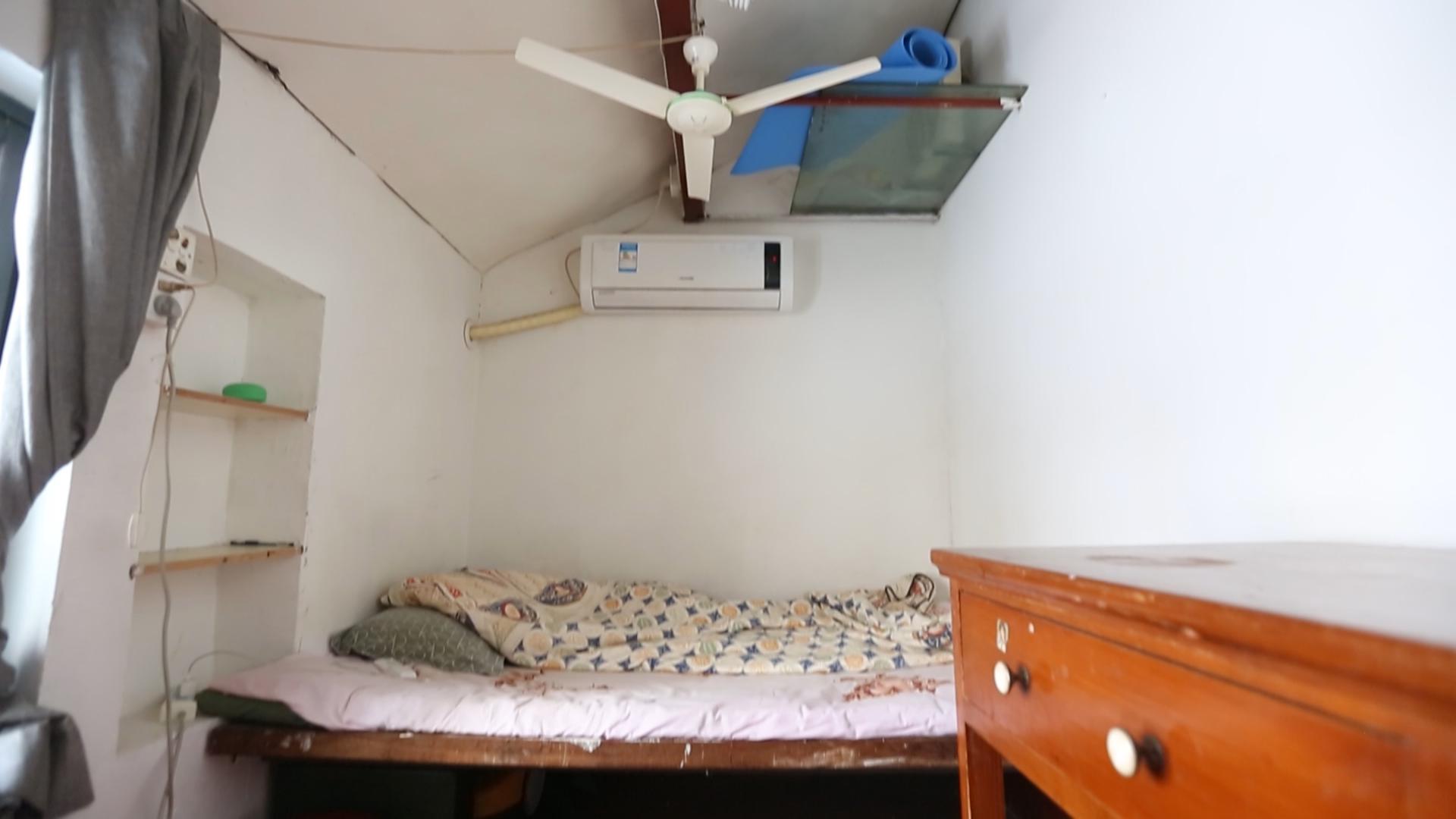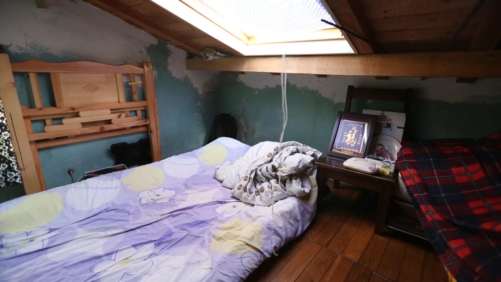 小黄父母的卧室在最低处的阁楼上,层高十分有限,最高的地方也只有1.5米,对于他们而言,在卧室里起身站立都是一种奢望。小黄的卧室虽然层高足够,但是采光极差,白天都需要开灯。房间内几乎没有储物空间,仅有一张嵌在墙上的单人床,身高178cm的他连睡觉都无法伸直。