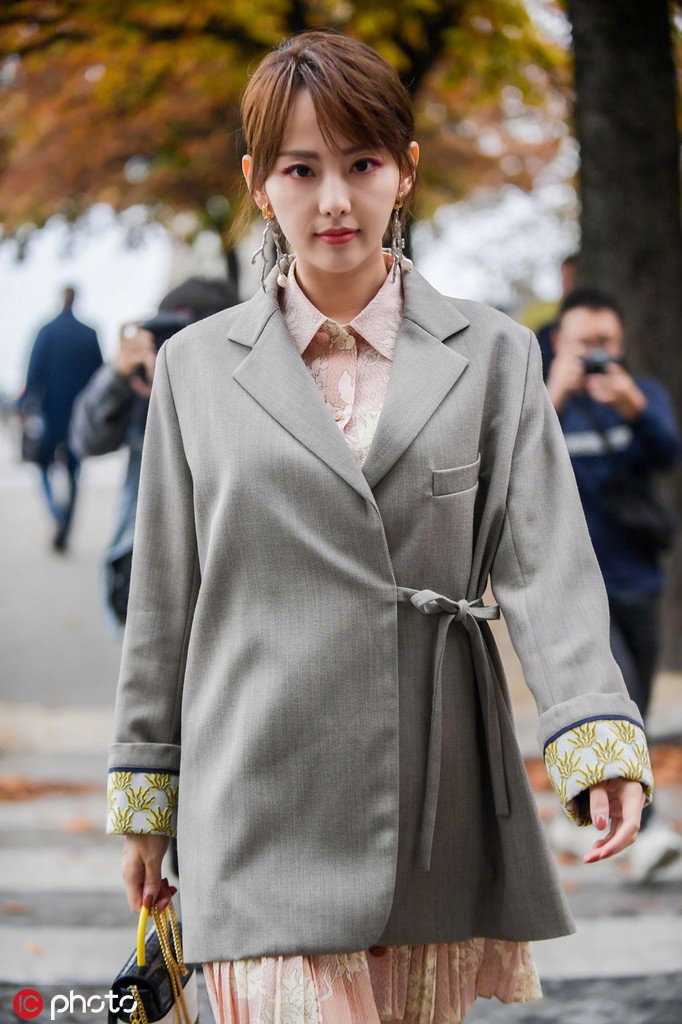 张嘉倪巴黎时装周生图曝光 西装外套内塔印花裙甜美帅气