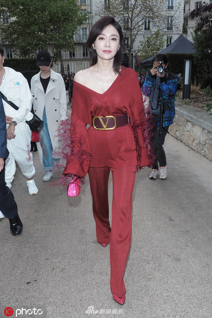 秦岚红色深V羽毛装亮相巴黎 大秀好身材