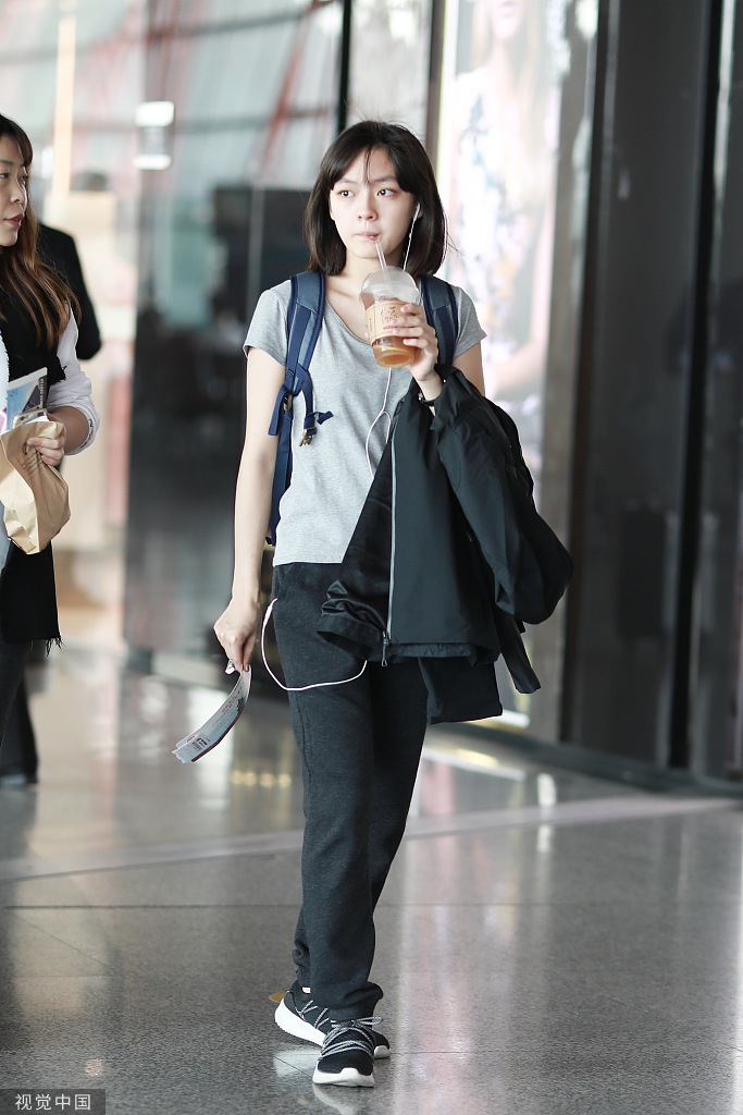 10月8日,北京,文淇现身机场。她素颜穿灰色T恤清纯可人,手拿一杯咖啡边走边喝活力满满。