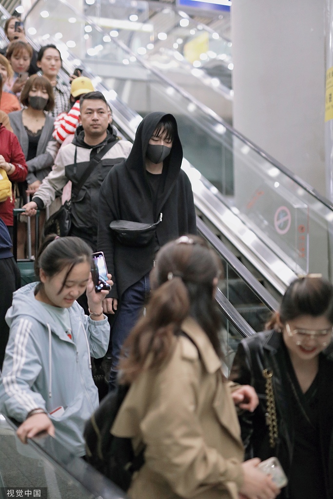 10月7日,北京,“摩登兄弟”刘宇宁亮相机场, 虽然航班延误至半夜,仍有上百名粉丝等待,刘宇宁身穿黑色外套和牛仔裤酷劲十足,疲惫至蹲在地上休息,状态不佳。