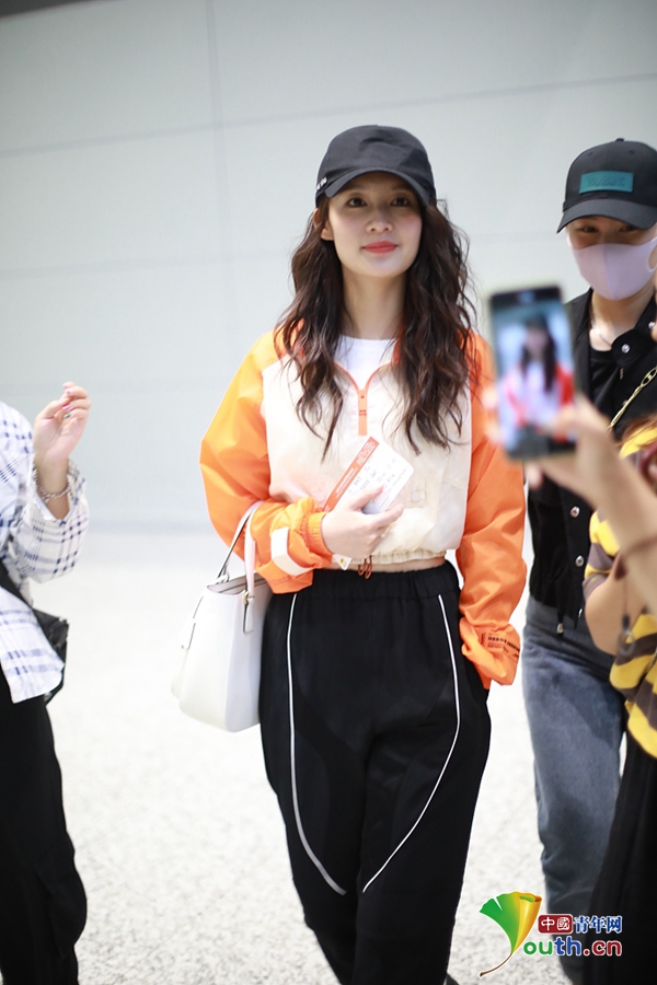 2019年10月25日,广州,李沁现身机场。她戴鸭舌帽少女感十足元气满满, 穿橙色运动上衣秀腰线化身“小腰精”。