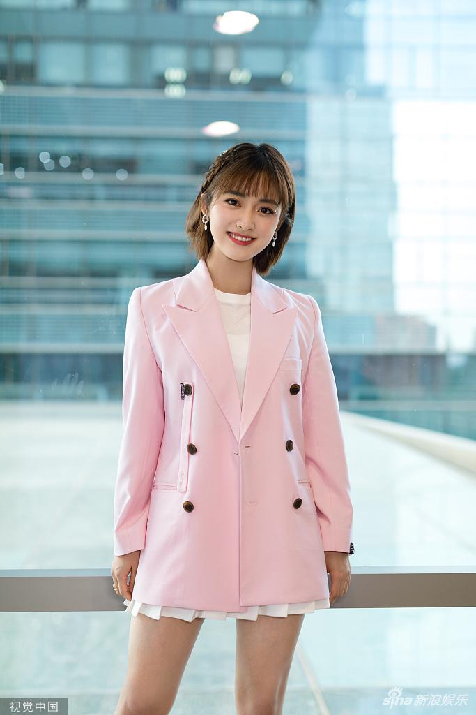 沈月粉色西装秀细白美腿 甜美灿笑元气少女感十足