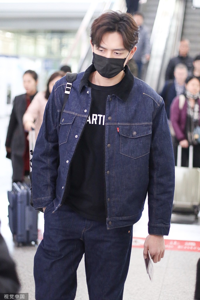 11月18日,李现现身北京机场,他身穿牛仔套装搭配中分韩式短发,一路口罩遮面前行,随后摘下口罩露出甜笑,对着粉丝挥手。(视觉中国/图)
