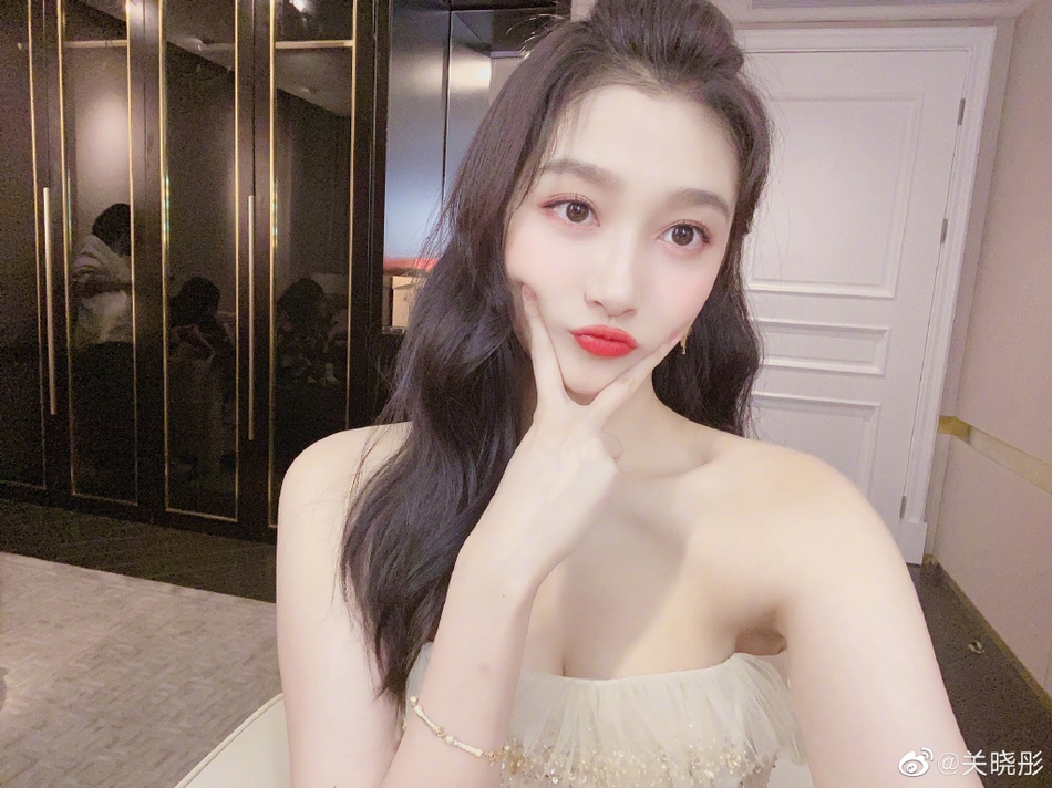 关晓彤抹胸礼服小露香肩 妆容精致对镜比心卖萌不停