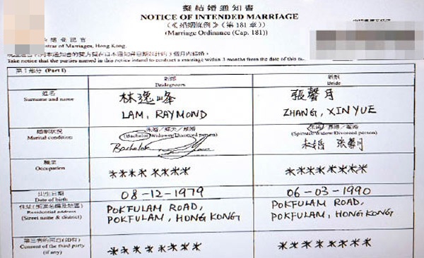 10月4日,林峯张馨月拟结婚通知书曾曝光。