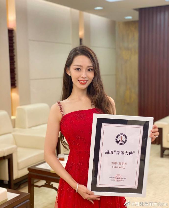 吉娜获“音乐大使”称号,穿红裙甜笑显优雅气质