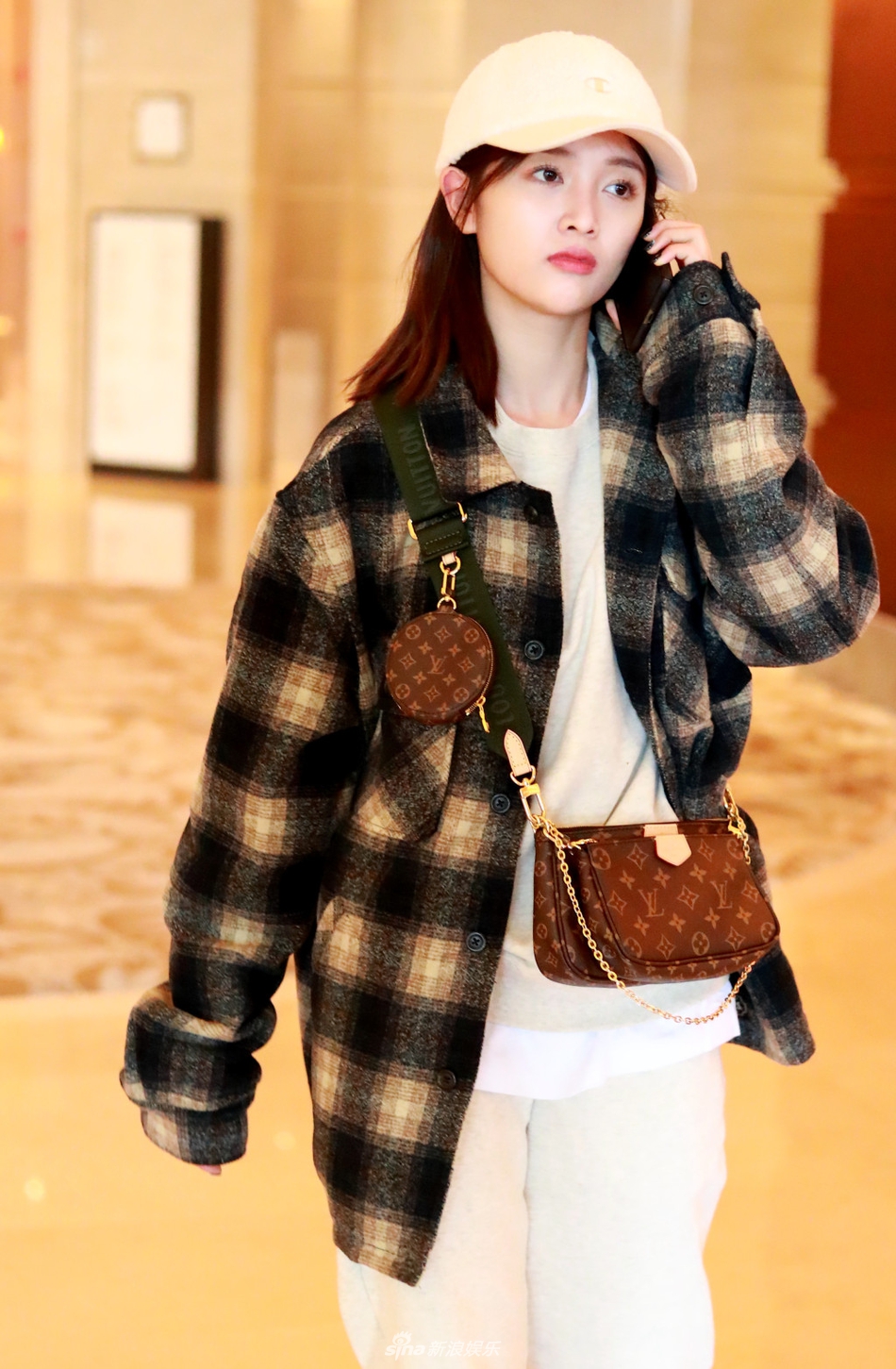 新浪娱乐讯 日前,吴宣仪头戴白色帽子 ,格子外套搭配白色休闲裤 ,斜背挎包现身某酒店 ,边走边打电话 ,显匆忙。