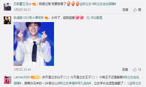 当陈立农“幸福特写九连拍”高清大图释出后,“农糖”们纷纷前来表白,调侃陈立农“昨天是立农仙子,今天是立农王子”。陈立农帅气的造型也让大家高呼“太帅了,超甜超爱”,并称“甜度过高,我要甜晕了”。