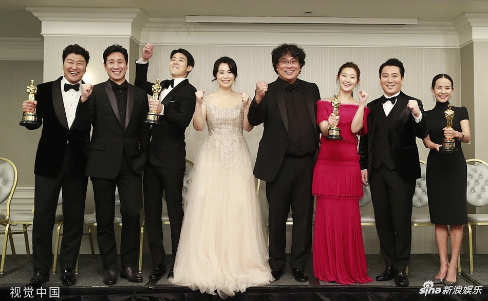 新浪娱乐讯 当地时间2020年2月10日下午,美国好莱坞,电影《寄生虫》剧组出席第92届奥斯卡颁奖典礼记者招待会。奉俊昊、宋康昊、李善均、赵汝贞、崔宇植、朴素丹等主创轮流拿起小金人。(视觉中国/图)