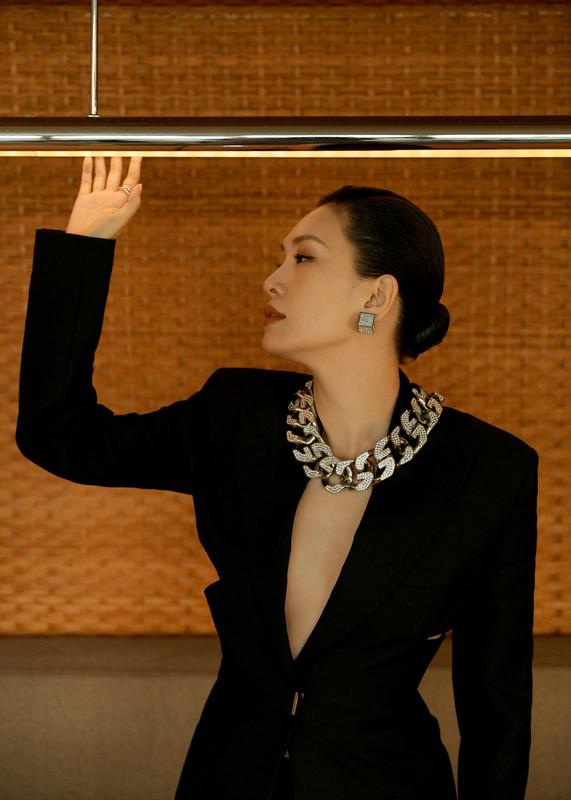 脖颈上佩戴着Givenchy的大号项链,旋转的链节一环扣着一环,给深色稍显沉重的服装又添加了一抹亮色。同时也正好还填补了上部分的空白。再佩戴上镶嵌了上百颗白色施华洛世奇水晶的立方体造型耳钉,使红毯上的佟晨洁整个人看上去格外的沉稳大气。在这一套项链耳环和礼服的搭配下,佟晨洁不仅酷飒十足还多了几分高贵文雅,整个的气质也愈发迷人,整体造型时尚度满分,尽显王者御姐风范。