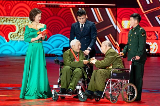 此外,百岁军人段飞、朱鹏祥,两位在一个战壕里浴血奋战过的战友,坐着轮椅在春晚现场再重逢,新一代的军人为他们致敬并送上荣誉勋章,保家卫国的精神传承赓续。