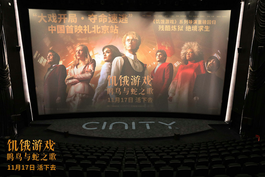 由美国狮门影片公司出品,中国电影集团公司进口,中国电影股份有限公司发行、译制的电影《饥饿游戏:鸣鸟与蛇之歌》于11月14日举办“大戏开局·夺命速逃”中国首映礼,分别在北京与南京两地与影迷朋友们提前见面!活动现场惊喜不断,不仅有“奇迹战歌”循环播放,带人一秒入戏;更有主演汤姆·布莱斯和导演弗朗西斯·劳伦斯二人的问候视频高能播出,给现场观众增添了更具仪式感与代入感的观影乐趣!此外,影片今日还释出了一组“恶魔诞生”主题海报,膨胀的权力步步引诱,导师与贡品将走向何种结局?影片将于11月17日以4K/IMAX/CINITY/CGS中国巨幕/4DX/DTSX版本全球同步上映,逃杀待启,谁能存活!